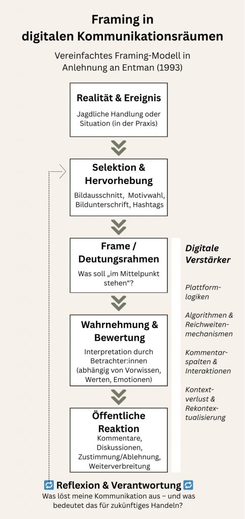 Gerade in digitalen Kommunikationsräumen, in denen Inhalte aus ihrem ursprünglichen Kontext gelöst, neu gerahmt und weiterverbreitet werden, gewinnt Framing besondere Bedeutung. Die Framing-Theorie bietet daher einen wichtigen theoretischen Rahmen, um die empirischen Ergebnisse zur Wahrnehmung jagdlicher Bildkommunikation einzuordnen.